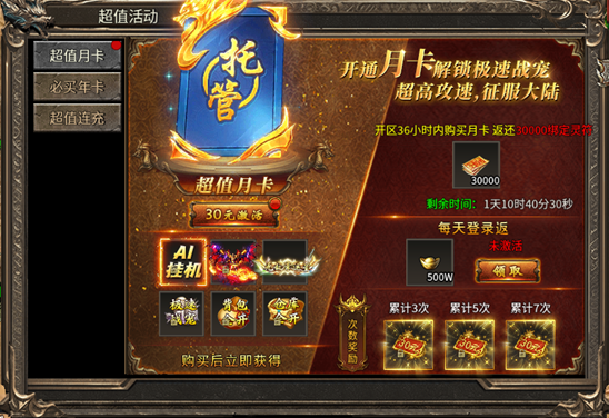 活动内容:活动时间内,开通激活月卡可获得对应奖励,每日登录还可以返还元宝。