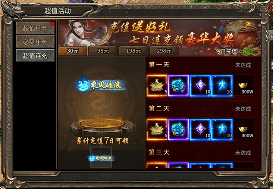 活动内容:活动时间内,7日连续充值对应金额可以领取相应奖励。