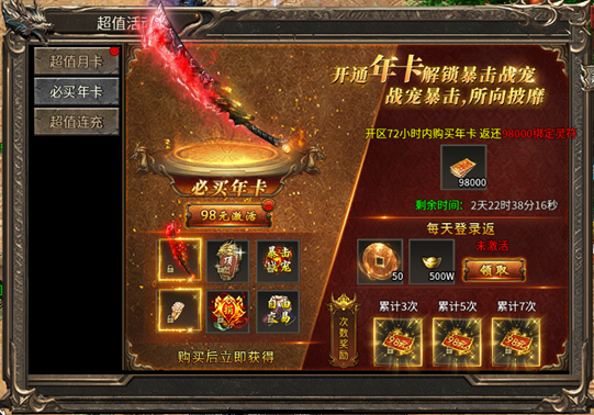 活动内容:活动时间内,开通激活年卡可获得对应奖励,每日登录还可以返还元宝等。